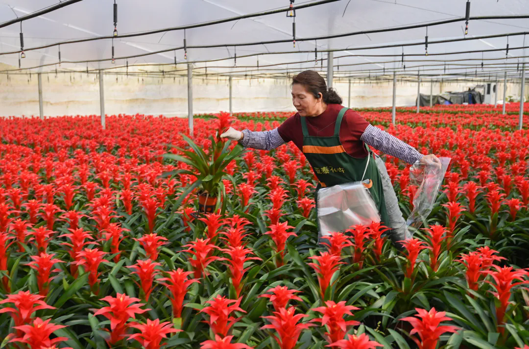 1月8日,在山东省青州市弥河镇一处花卉种植基地,农民在暖棚里挑选凤梨花。王继林摄(中经视觉)