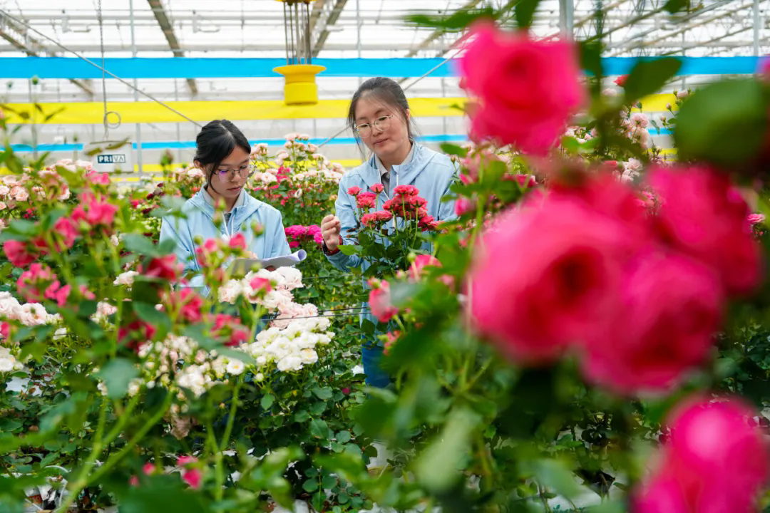 2025年5月18日,昆明斗南国际花卉技术创新中心工作人员在查看并记录月季新品种生长情况。陈欣波摄(新华社)