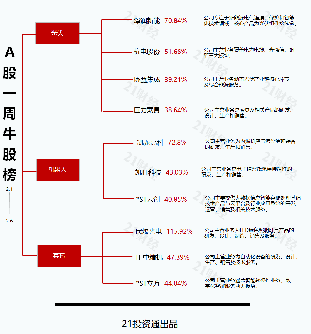 剔除最近一个月上市的次新股,本期牛股榜中,民爆光电(301362.SZ)以115.92%的周涨幅夺魁,凯龙高科(300912.SZ)以72.8%的周涨幅位居第二,泽润新能(301636.SZ)、杭电股份(603618.SH)周涨幅均达50%以上,牛股榜10只个股周涨幅均超38%。