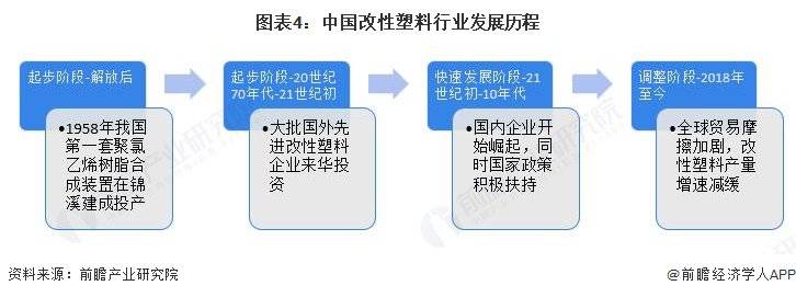 进入21世纪,我国制造业发展迅速,其中汽车及家电产品快速普及,随着全球节能环保意识的不断增强,促使汽车及家电产品向轻量化、轻薄化方向发展,塑料制品对金属等材料替代效应明显。同时,随着国内航天、高铁、新能源等产业迅速兴起所带来的新材料需求的不断释放,以及国内资本市场的持续发展,国内部分改性塑料企业快速发展,规模迅速扩大,技术不断提升,在配方设计方面具备较强的技术能力,部分改性塑料产品性能已经达到国际先进水平,并逐步应用于高端领域,助推我国发展成为世界塑料大国。中国改性塑料行业发展历程如下: