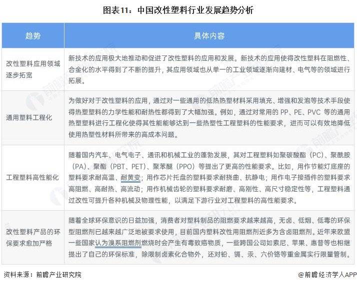 随着国民经济迅速发展和改性塑料产品市场容量的进一步扩大,以及国家各级政府部门对改性塑料行业发展的支持,改性塑料行业将获得更好的发展机遇,目前我国改性塑料行业发展呈现应用领域逐步拓宽、工程塑料高性能化、环保要求愈加严格等趋势。未来,改性塑料将向高性能化、环保化、多功能化方向发展,并逐渐渗透到更多应用领域。